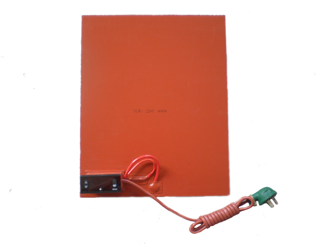 此款硅橡胶恒温加热器主要用于热熔胶的加热,内部发热丝有镍铬合金丝或铁铬铝合金蚀刻片可选,该系列产品可根据使用者需要的电压、功率、规格大小、产品形状订做生产(如:椭圆形、锥形等),配有控温精准的数显温控。此款产品具有很好的柔性,整体厚度1.5MM,电压220V,功率800W,背部贴有耐高温双面胶,使用时直接粘贴在被加热体上既可,如在硅橡胶恒温加热器上配上铝板,其导热效果更佳。